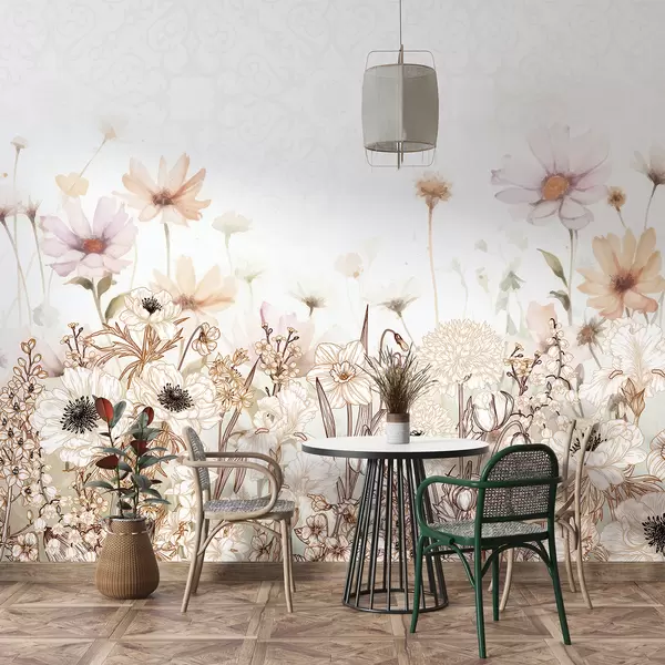 Fotomurales Un campo de flores y follaje blanco, beige y rosa sobre un fondo floral suave y difuminado Nr. w08259