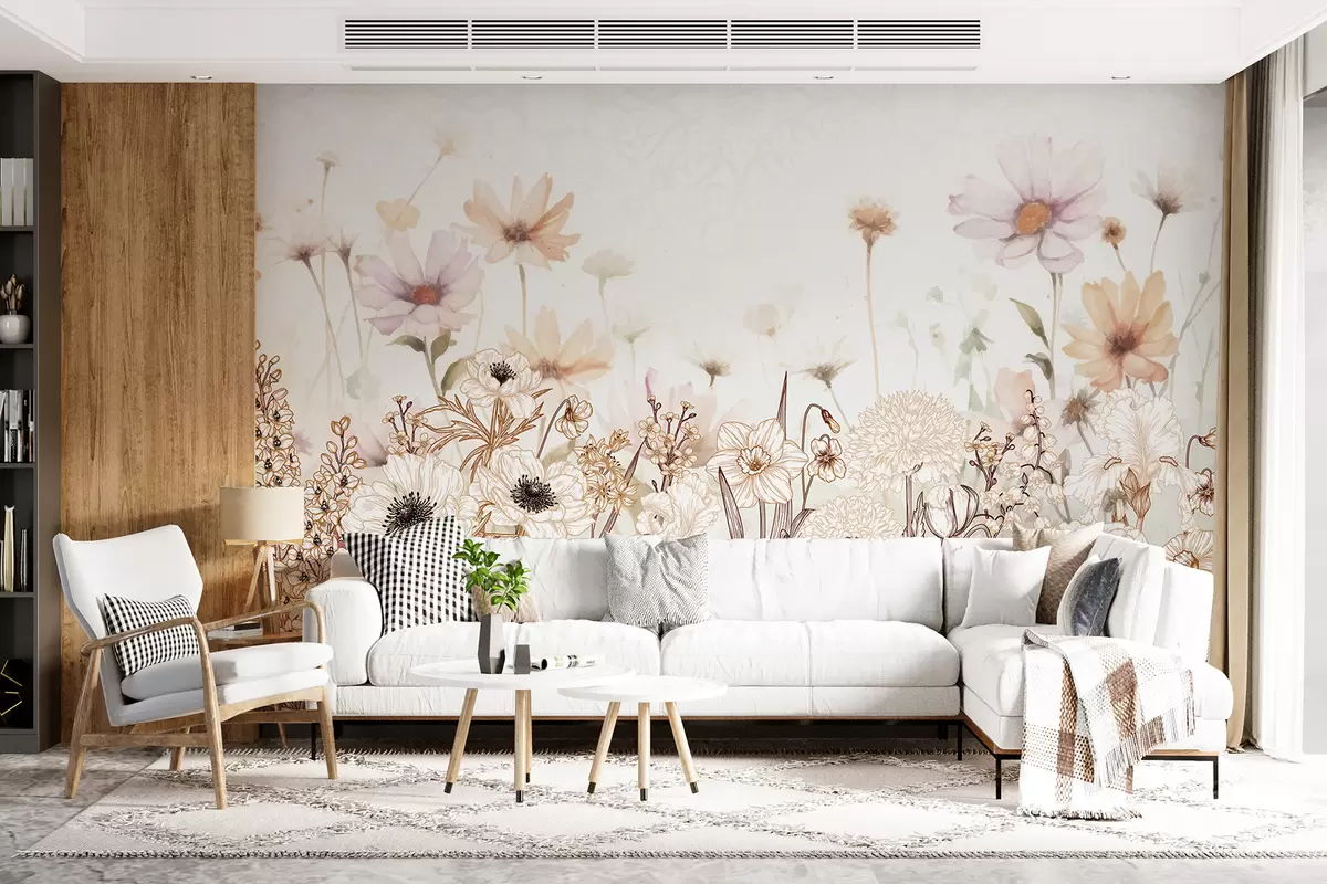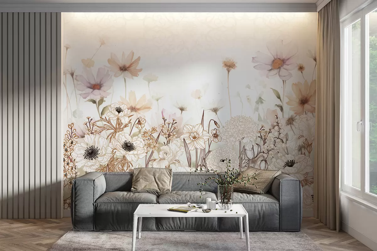 Fotomurales Un campo de flores y follaje blanco, beige y rosa sobre un fondo floral suave y difuminado Nr. w08259