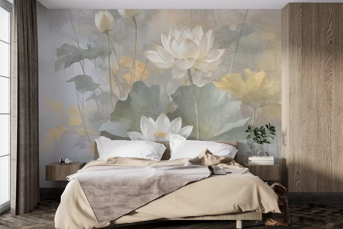 Fotomurales Flores de loto blancas con hojas en un estanque con un suave fondo difuminado amarillo y verde Nr. w08275