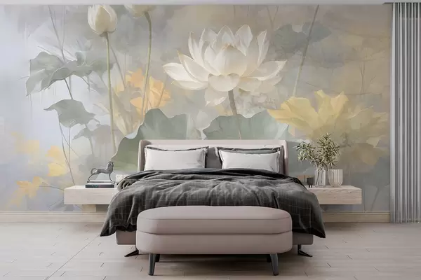 Fotomurales Flores de loto blancas con hojas en un estanque con un suave fondo difuminado amarillo y verde Nr. w08275