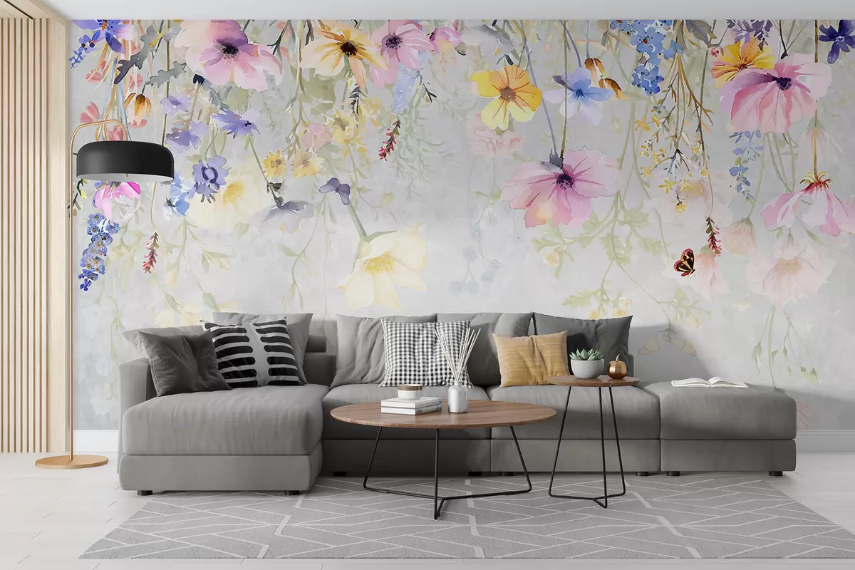 Fotomurales Flores de colores con flores rosas, amarillas y azules que cuelgan de la parte superior sobre fondo gris texturizado Nr. w08309