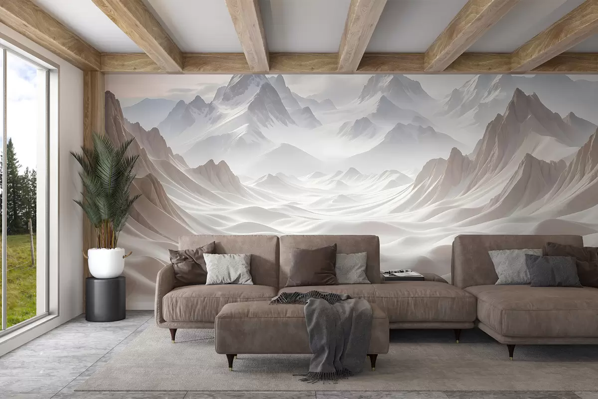 Fotomurales Picos montañosos nevados emergiendo de un paisaje brumoso y etéreo con suaves colinas y valles Nr. w08313