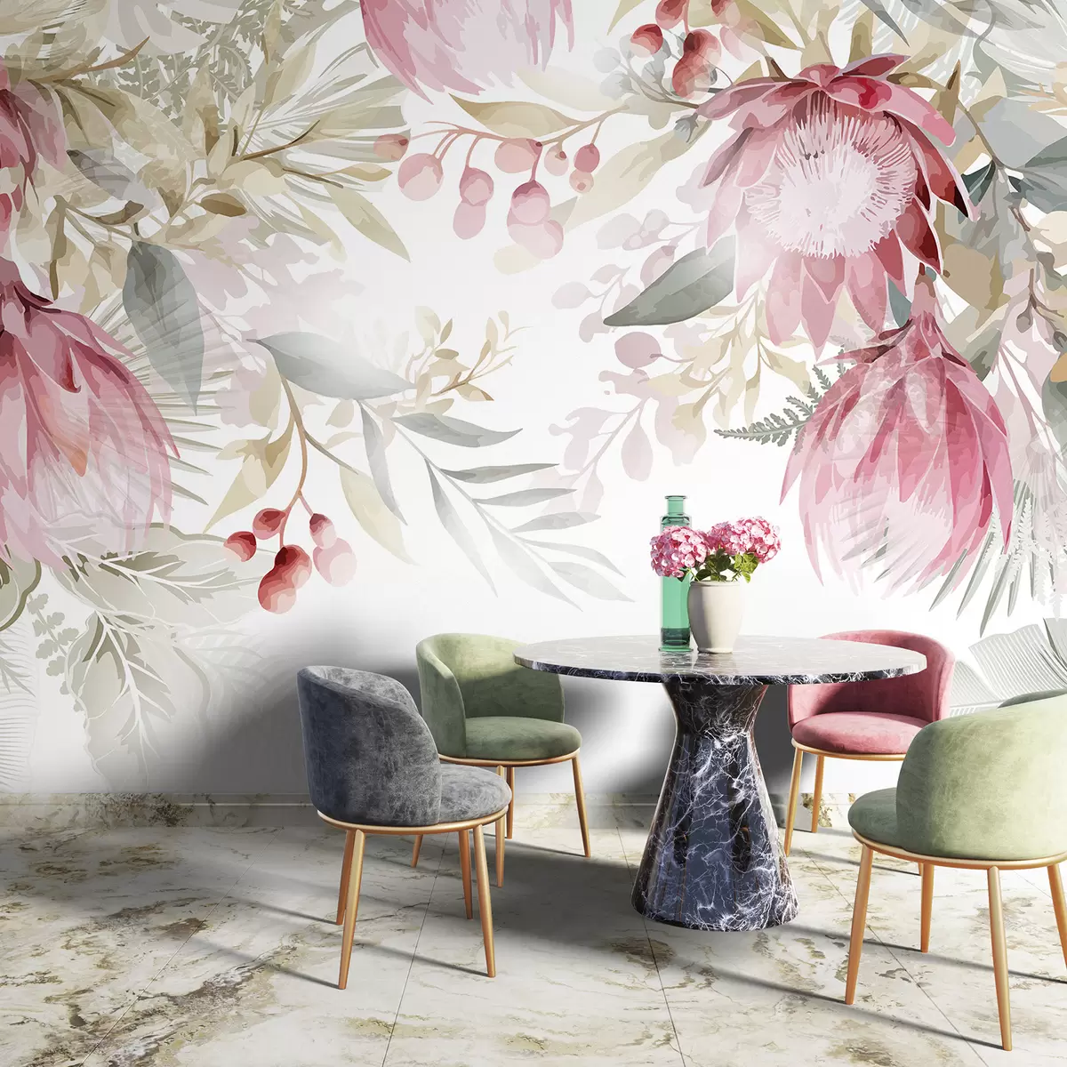 Fotomurales Grandes proteas rosas y blancas transparentes con exuberantes hojas verdes sobre un fondo claro Nr. w08315