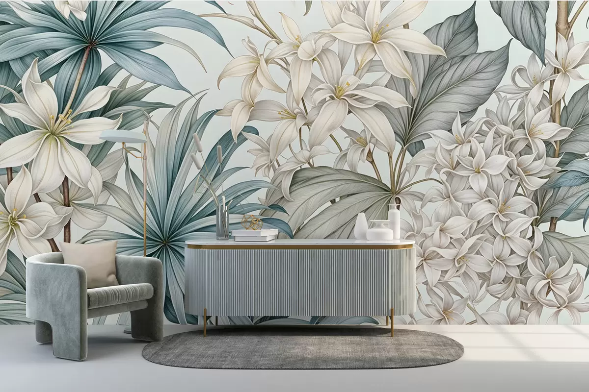 Fotomurales Estampado floral tropical con grandes flores blancas y azul claro, hojas verdes y fondo neutro Nr. w08318