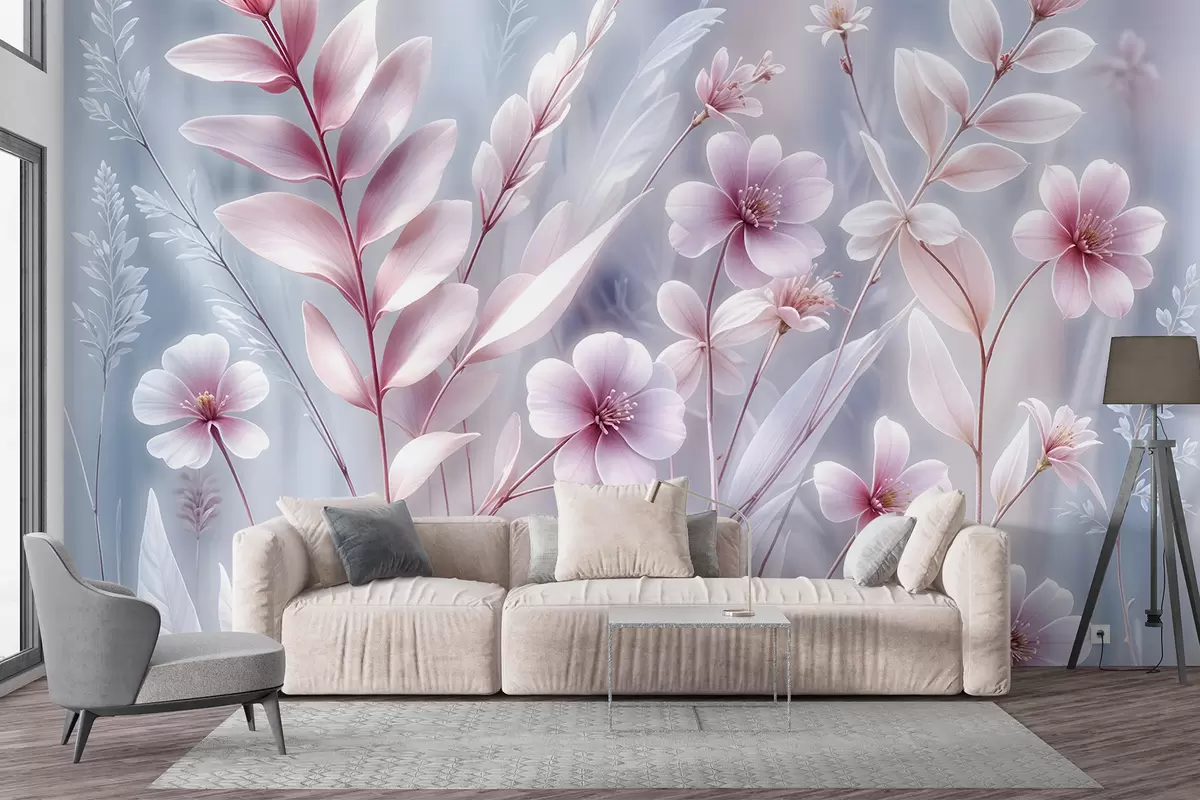 Fotomurales Delicadas flores rosas con suaves pétalos y hojas sobre un fondo abstracto gris pálido Nr. w08323