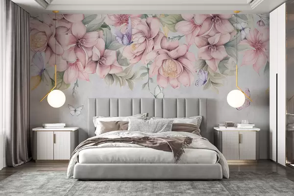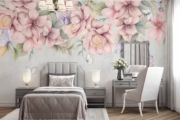 Fotomurales Suaves flores rosas y blancas con delicadas flores y hojas sobre fondo gris texturizado Nr. w08331