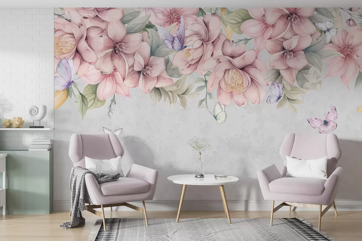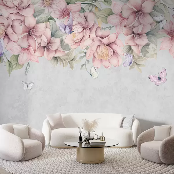 Fotomurales Suaves flores rosas y blancas con delicadas flores y hojas sobre fondo gris texturizado Nr. w08331