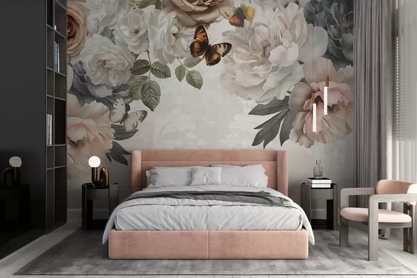 Fotomurales Grandes flores de peonía blancas y rosas con una mariposa posada en una de las flores sobre un fondo suave y difuminado Nr. w08340