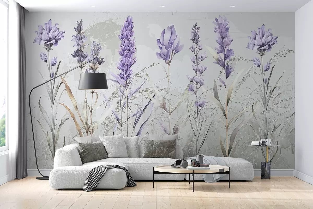 Fotomurales Un campo de flores de lavanda de acuarela púrpura con fondo beige de textura suave y borrosa Nr. w08346