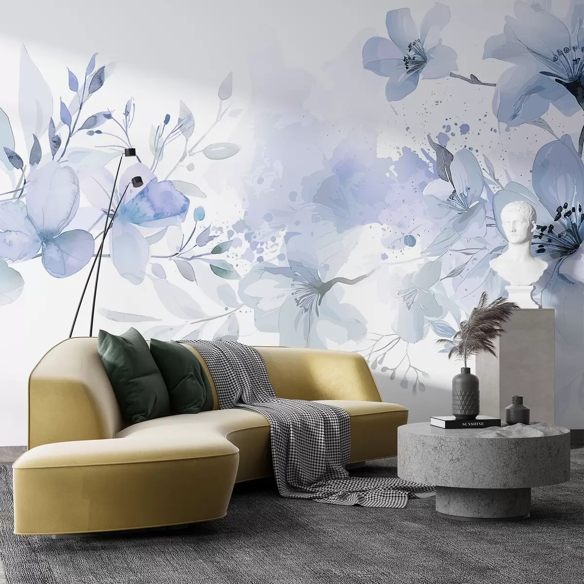 Fotomurales Un ramo de delicadas flores azules y blancas con pétalos suaves y difuminados sobre un fondo de acuarela ligero y aireado Nr. w08348v1