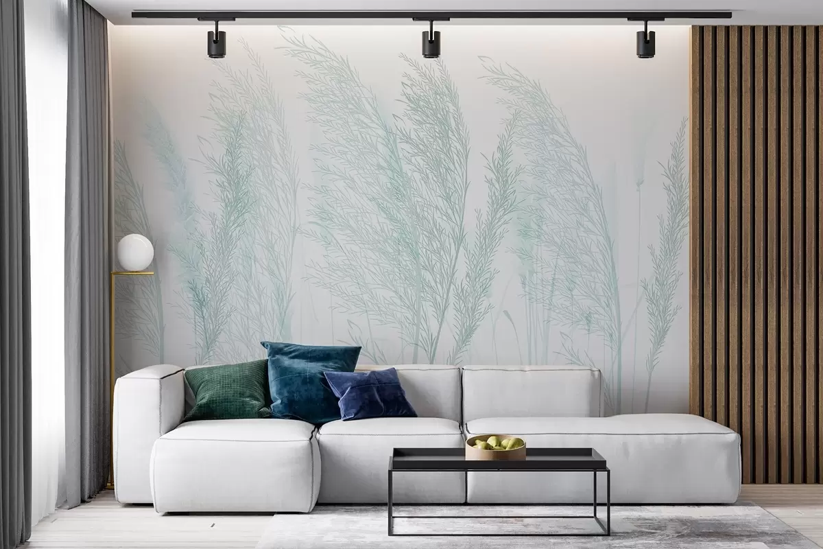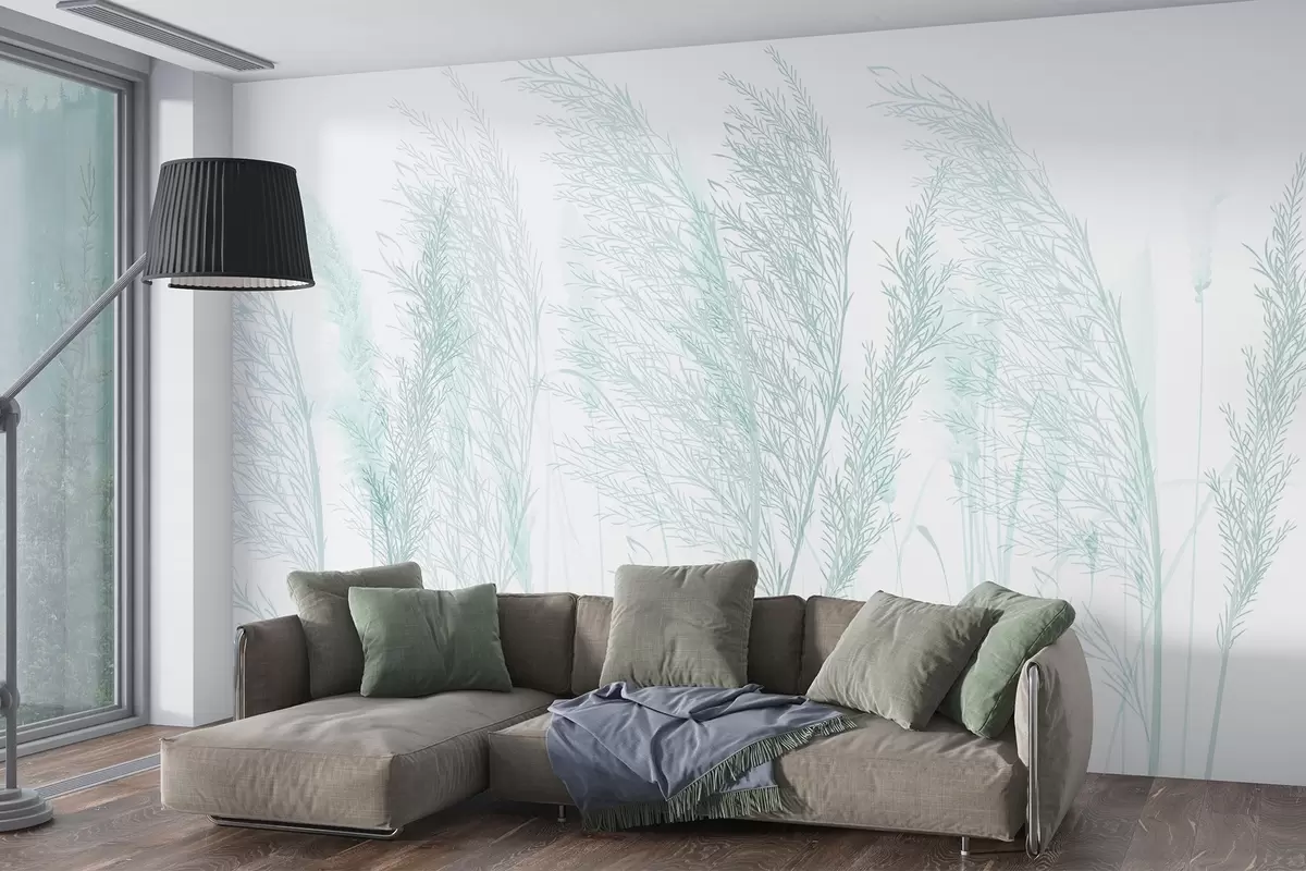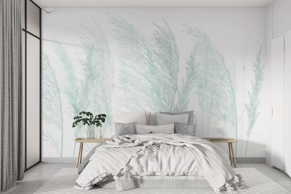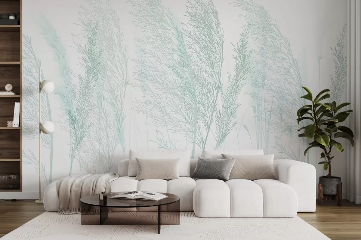 Fotomurales Delicado pastel turquesa suave hierba de la pampa contra un fondo blanco composición minimalista Nr. w08351v2