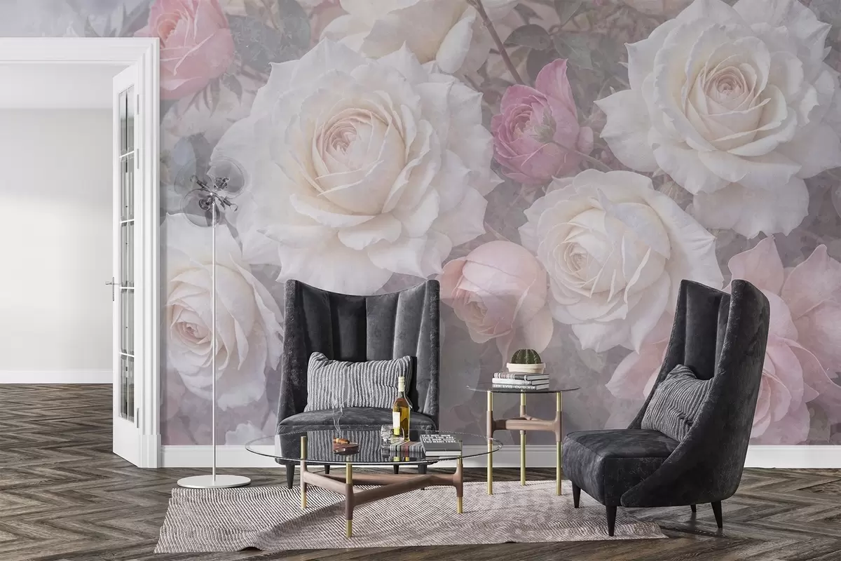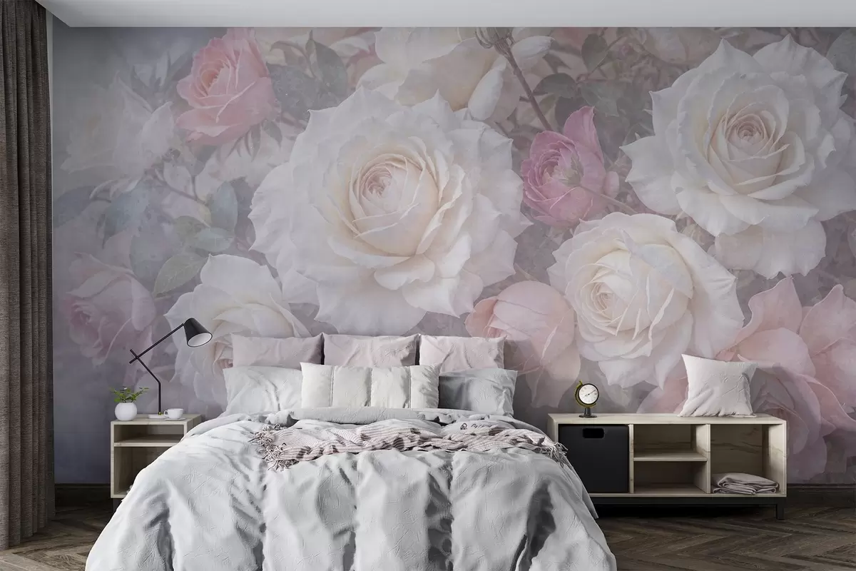 Fotomurales Rosas y peonías de suaves colores pastel sobre un fondo difuminado de textura gris brumosa Nr. w08352