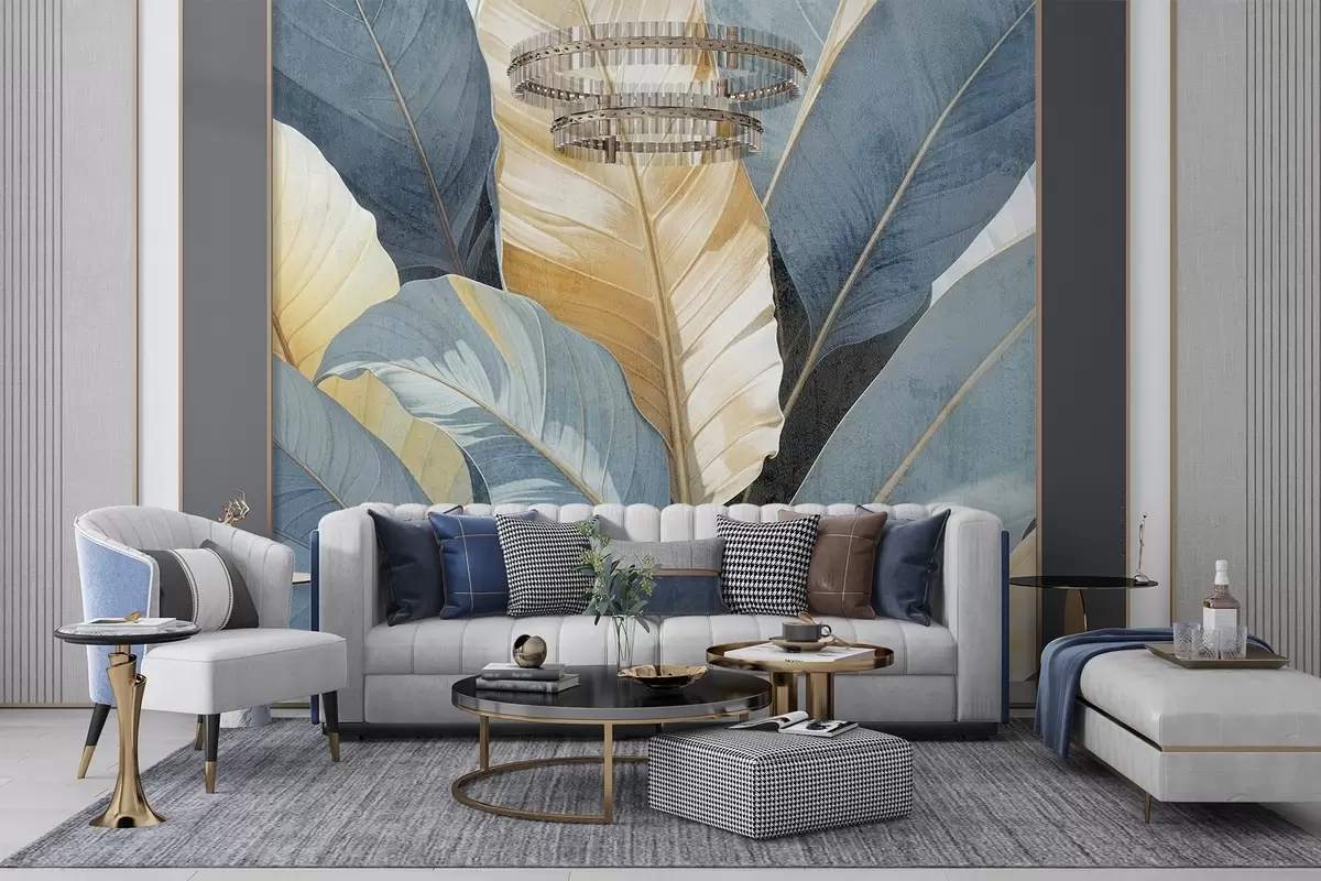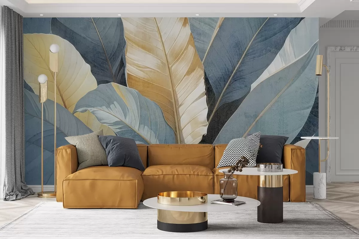 Fotomurales Primer plano de grandes y exuberantes hojas tropicales decorativas con textura en tonos azules, verdes y amarillos Nr. w08373