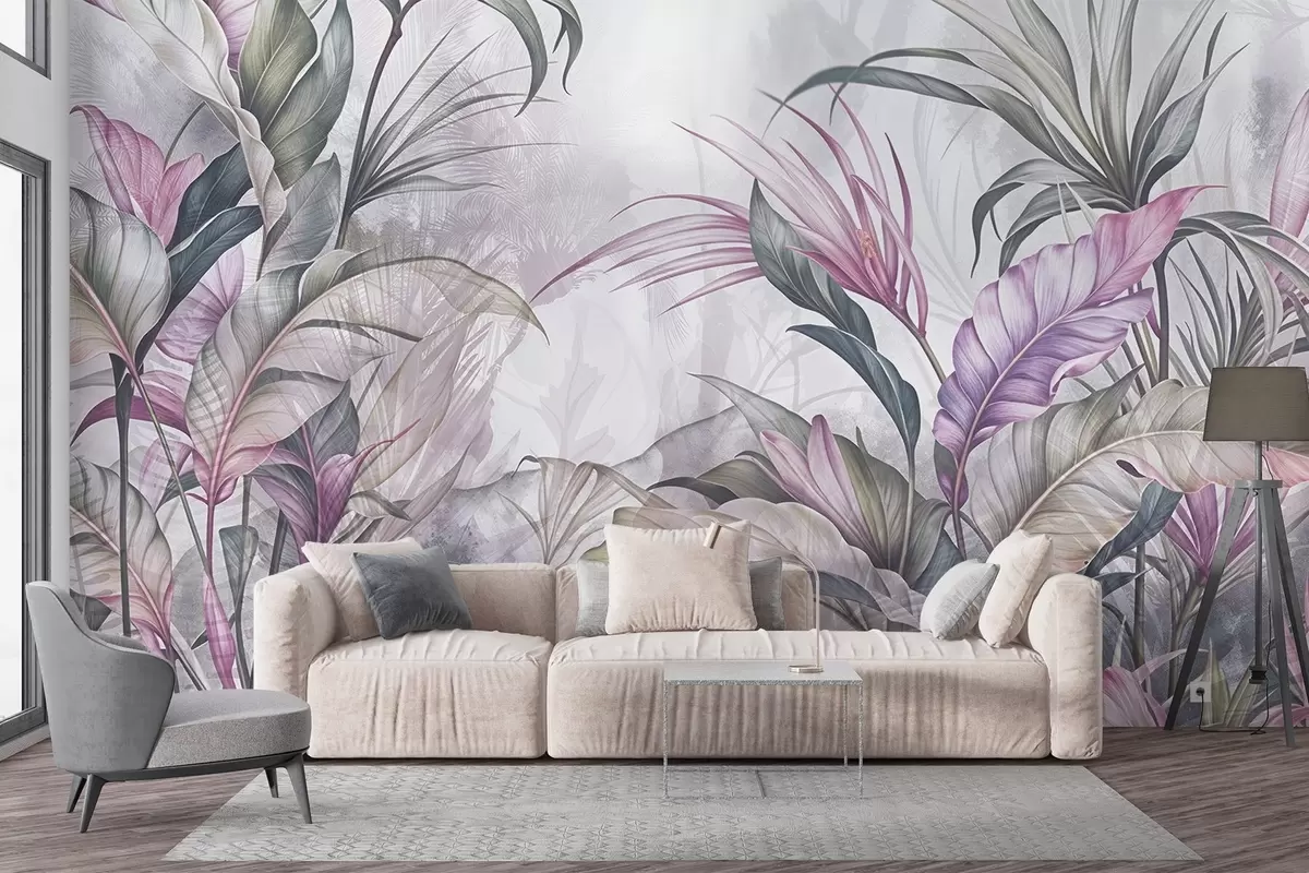 Fotomurales Selva tropical con grandes hojas verdes y flores de protea rosa con fondo borroso texturizado Nr. w08375v1