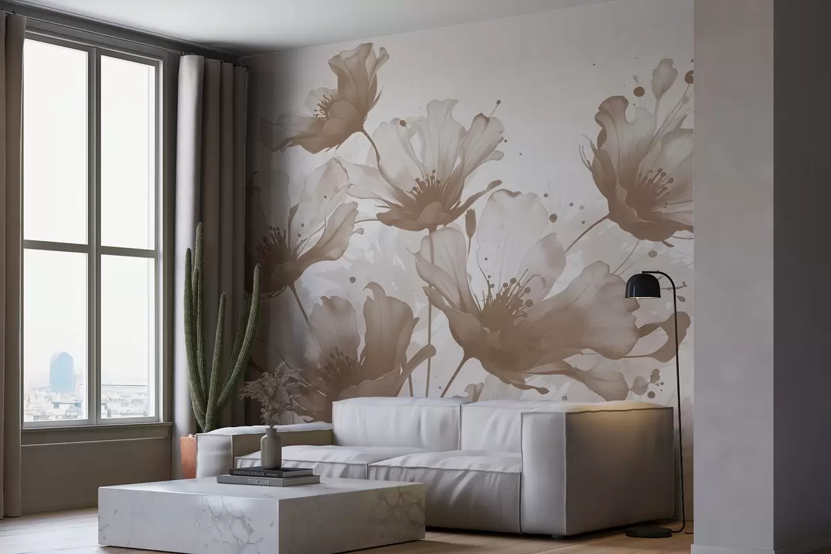 Fotomurales Delicadas flores marrones con pétalos suaves y difuminados y salpicaduras de acuarela sobre un fondo claro Nr. w08376v1