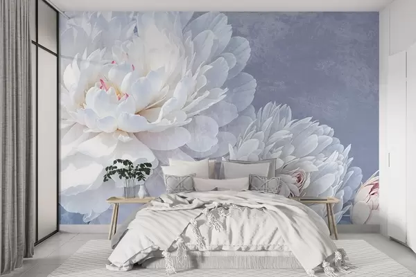 Fotomurales Flores de peonía blancas con pétalos suaves y delicados sobre un fondo de textura azul pastel claro Nr. w08379