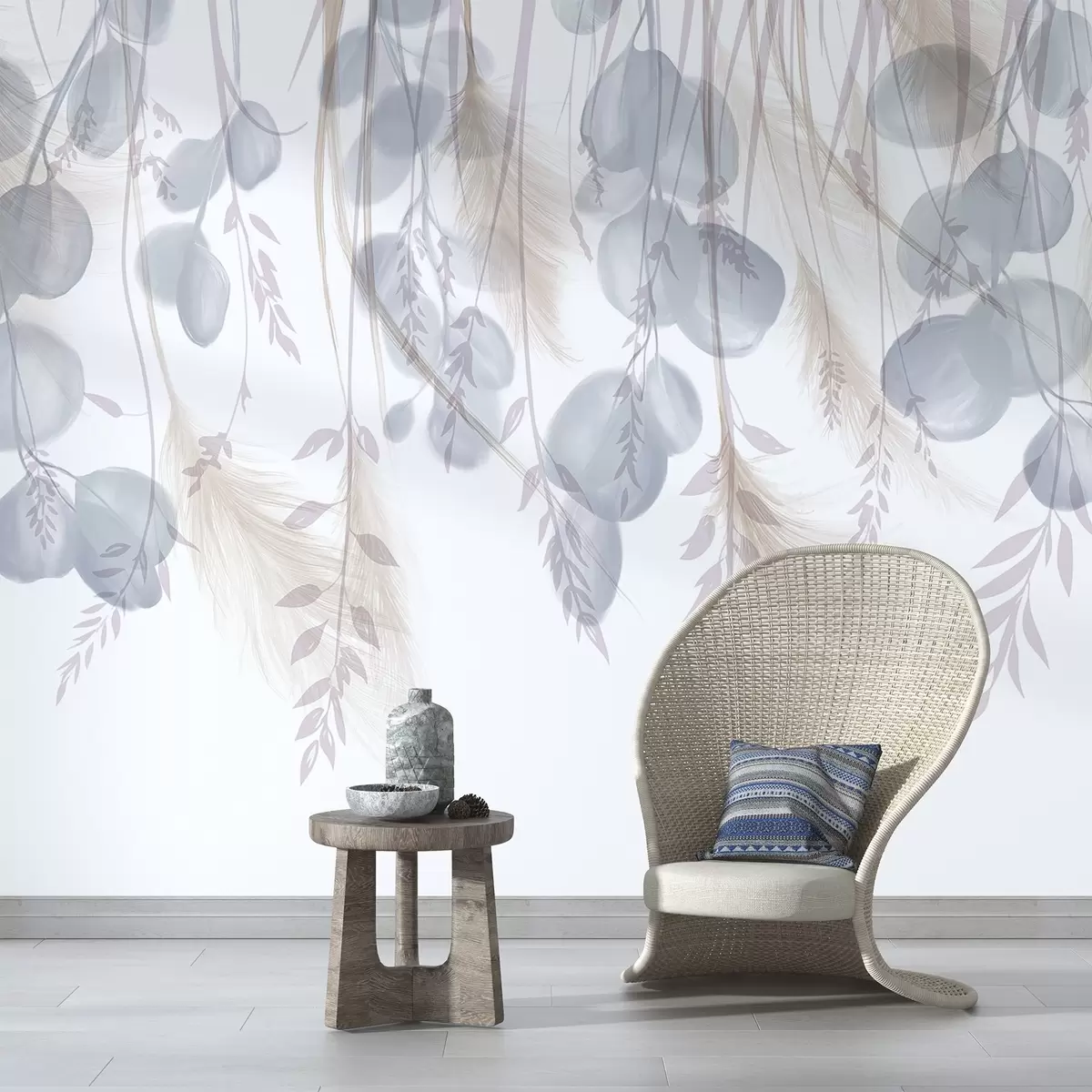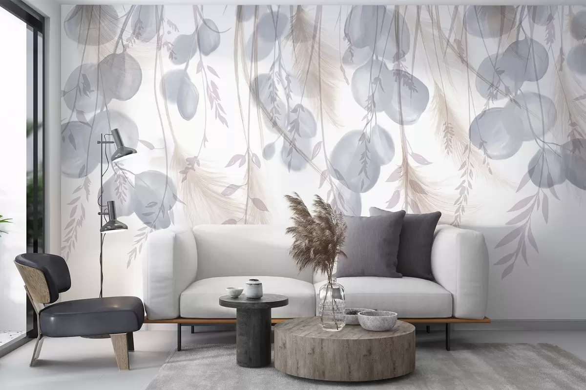 Fotomurales Delicadas hojas de eucalipto azul y beige pastel cayendo, creando una atmósfera serena y tranquilizadora Nr. w08380v1