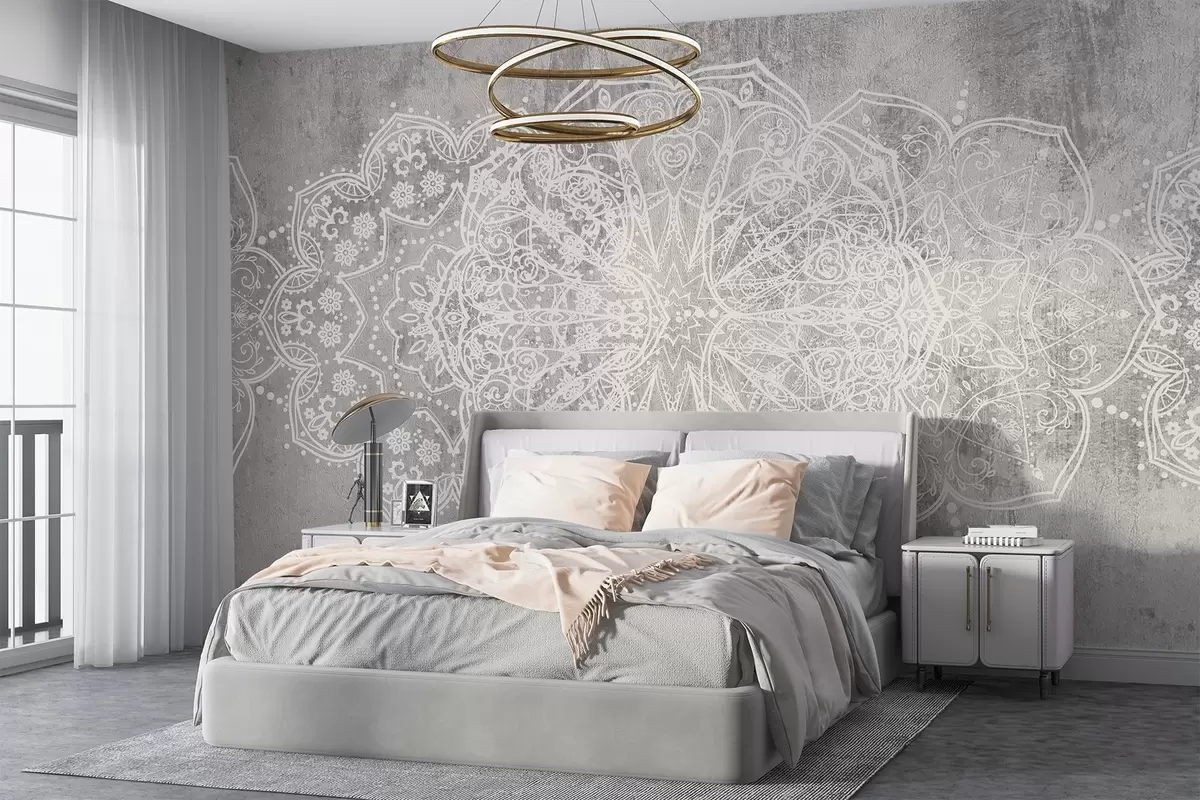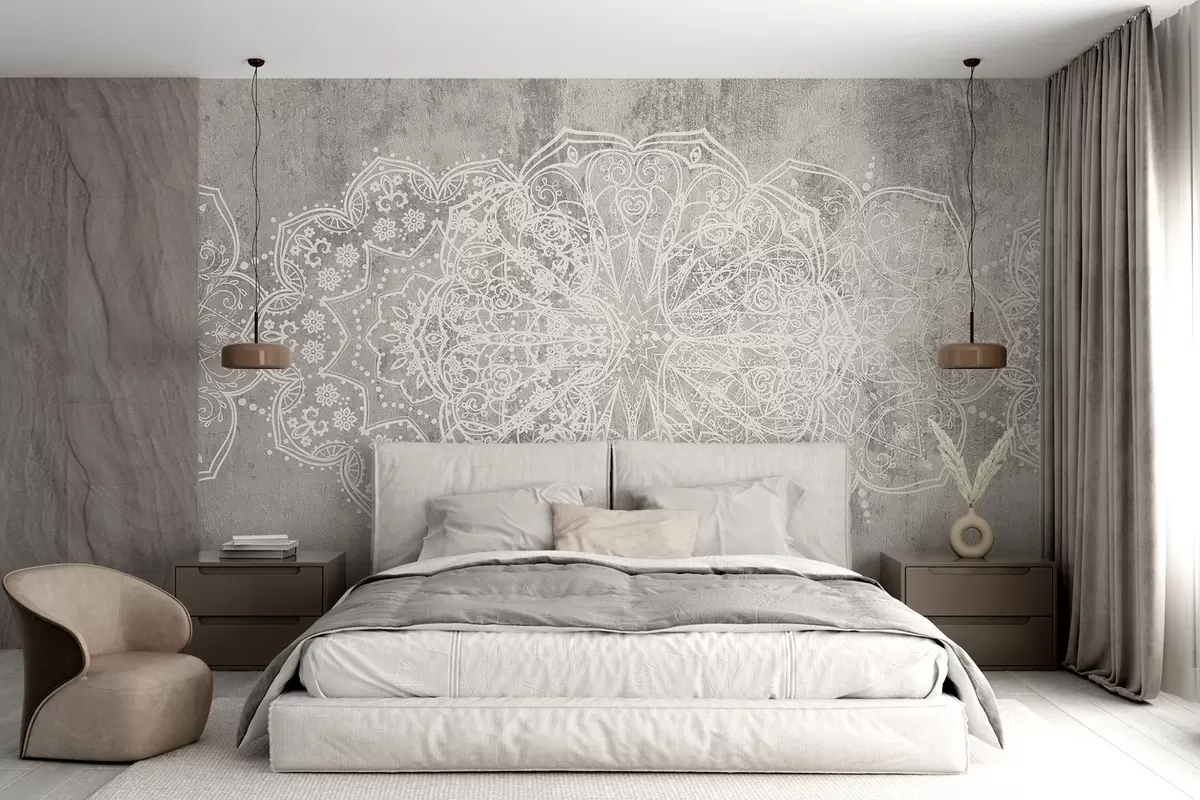 Fotomurales Un detallado e intrincado patrón de mandala de encaje blanco sobre un fondo de pared gris loft texturizado Nr. w08387