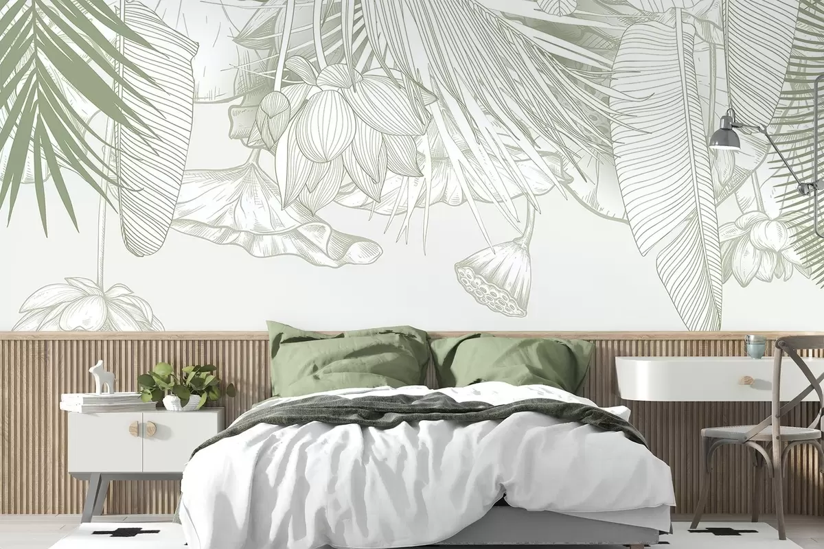 Fotomurales Un primer plano de un estampado floral verde con grandes pétalos y hojas superpuestas en un color monocromo Nr. w08389v1