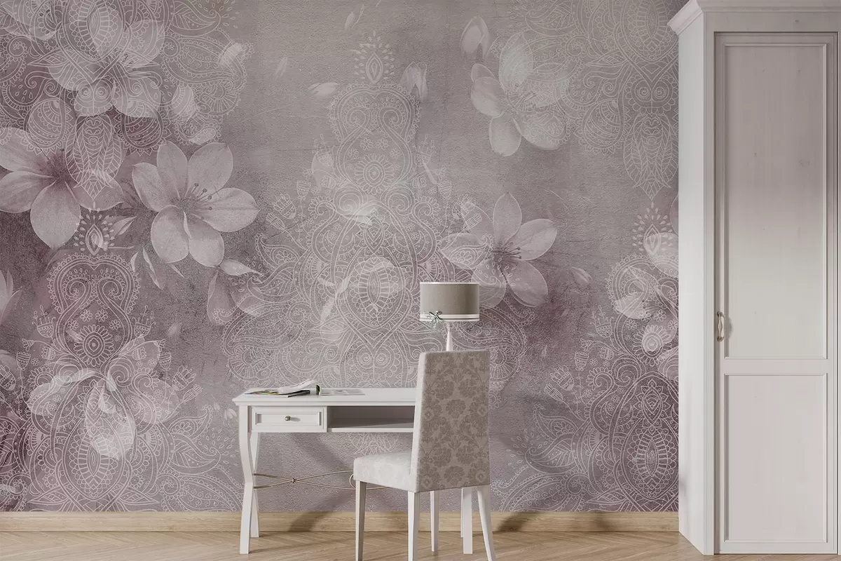 Fotomurales Dibujo de enfoque suave de delicadas flores blancas sobre un fondo borroso con textura de encaje bordo Nr. w08405v2