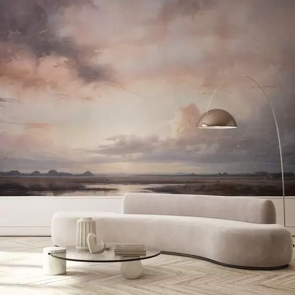 Fotomurales Impresión con textura de paisaje dramático de cielo nublado sobre un tranquilo lago al atardecer, con colinas visibles en la distancia. Nr. w08409