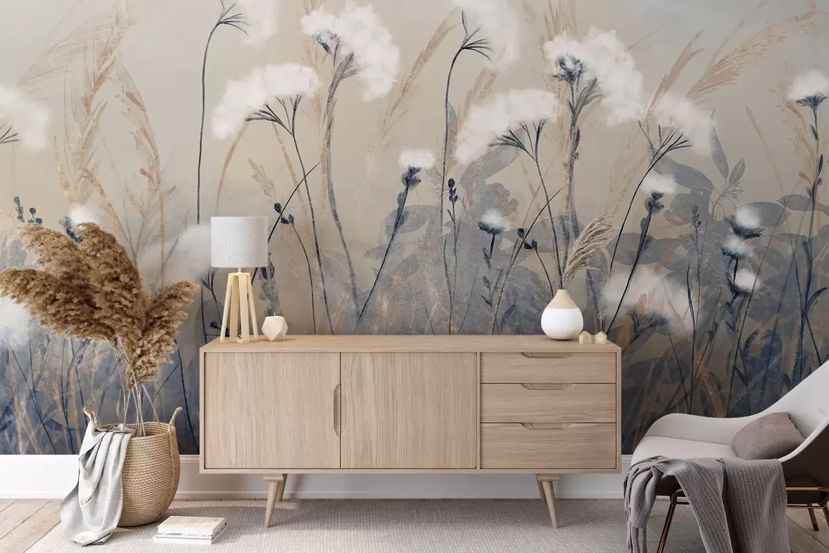 Fotomurales Hierba de algodón blanca y esponjosa sobre un fondo de textura borrosa, con una atmósfera suave, brumosa y serena Nr. w08416