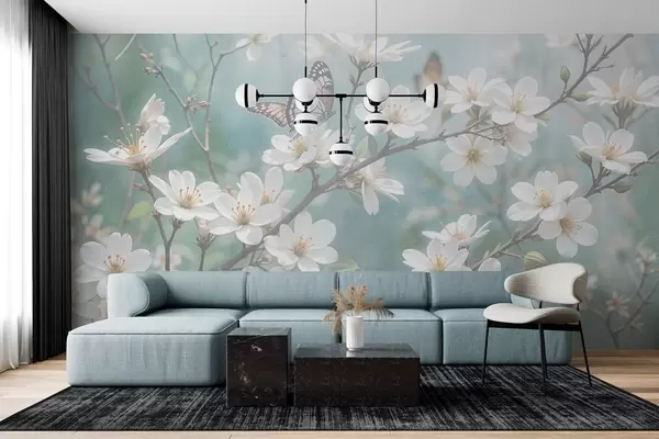 Fotomurales Una mariposa blanca sobre una rama con delicadas flores blancas de cerezo en primer plano sobre un fondo difuminado Nr. w08421