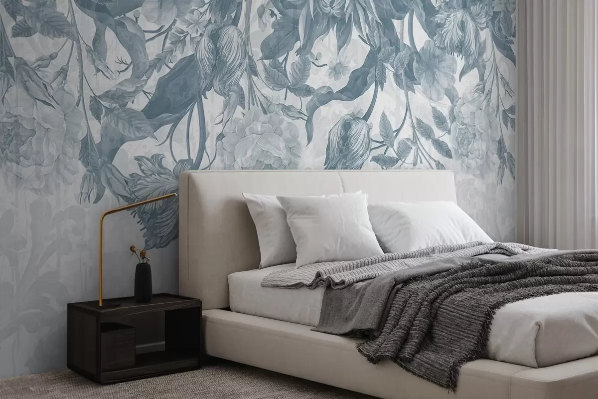 Fotomurales Un exuberante arreglo floral con grandes flores azules y blancas, con hojas y tallos en azul pastel Nr. w08435v1