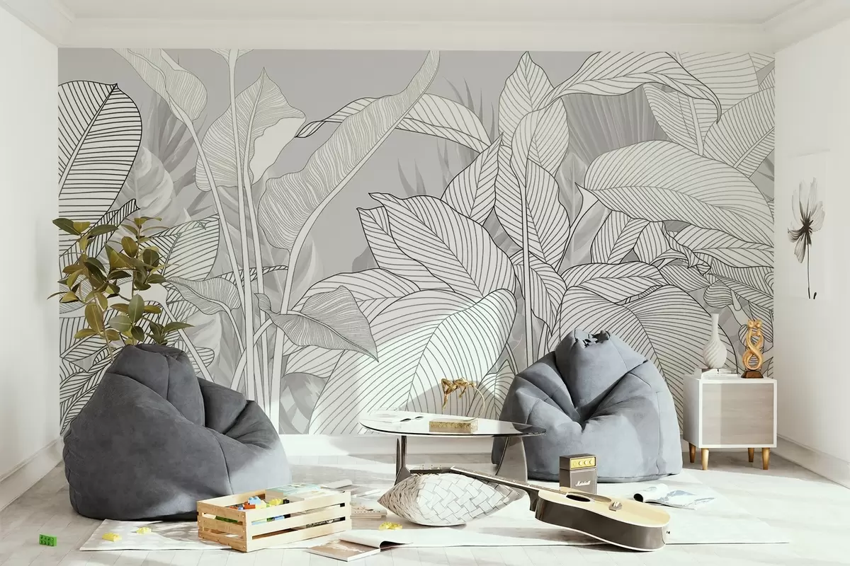 Fotomurales Ilustración monocroma de grandes hojas y follaje estilizados con intrincadas líneas y texturas Nr. w08436