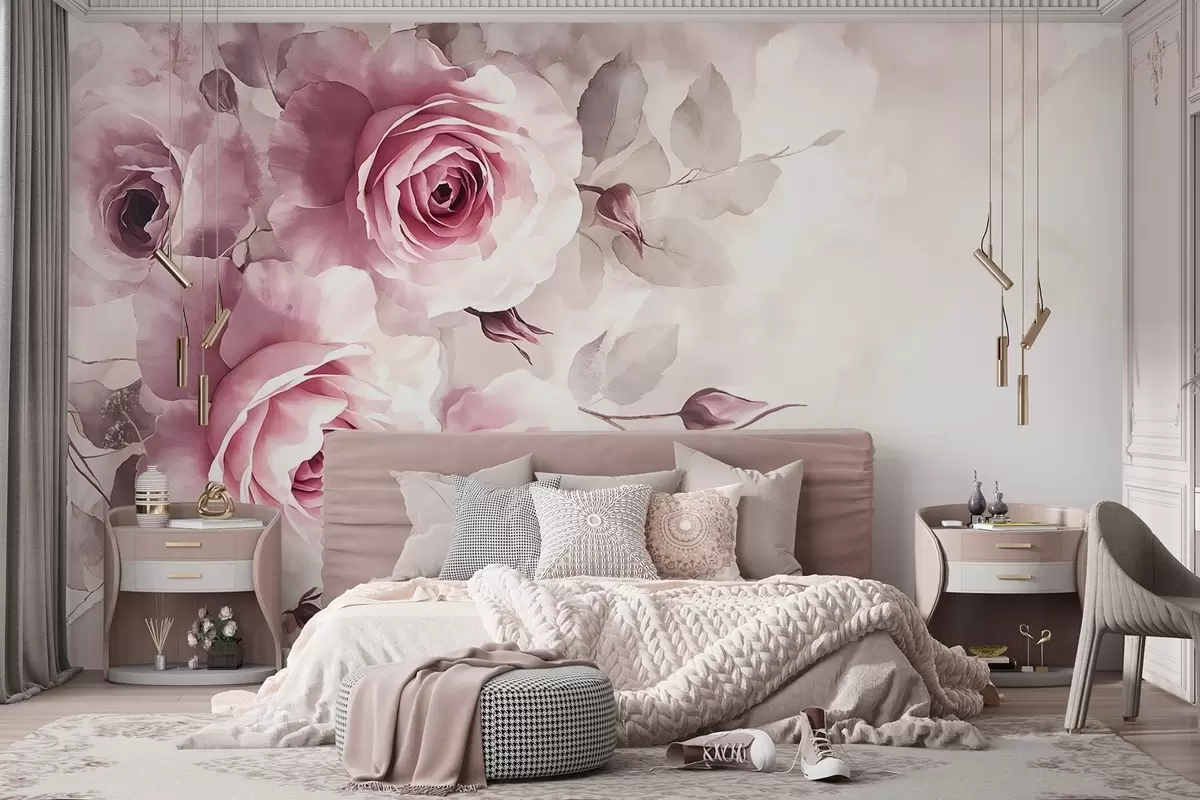 Fotomurales Delicadas rosas y hojas rosa pastel con fondo suave y difuminado imitación acuarela Nr. w08459