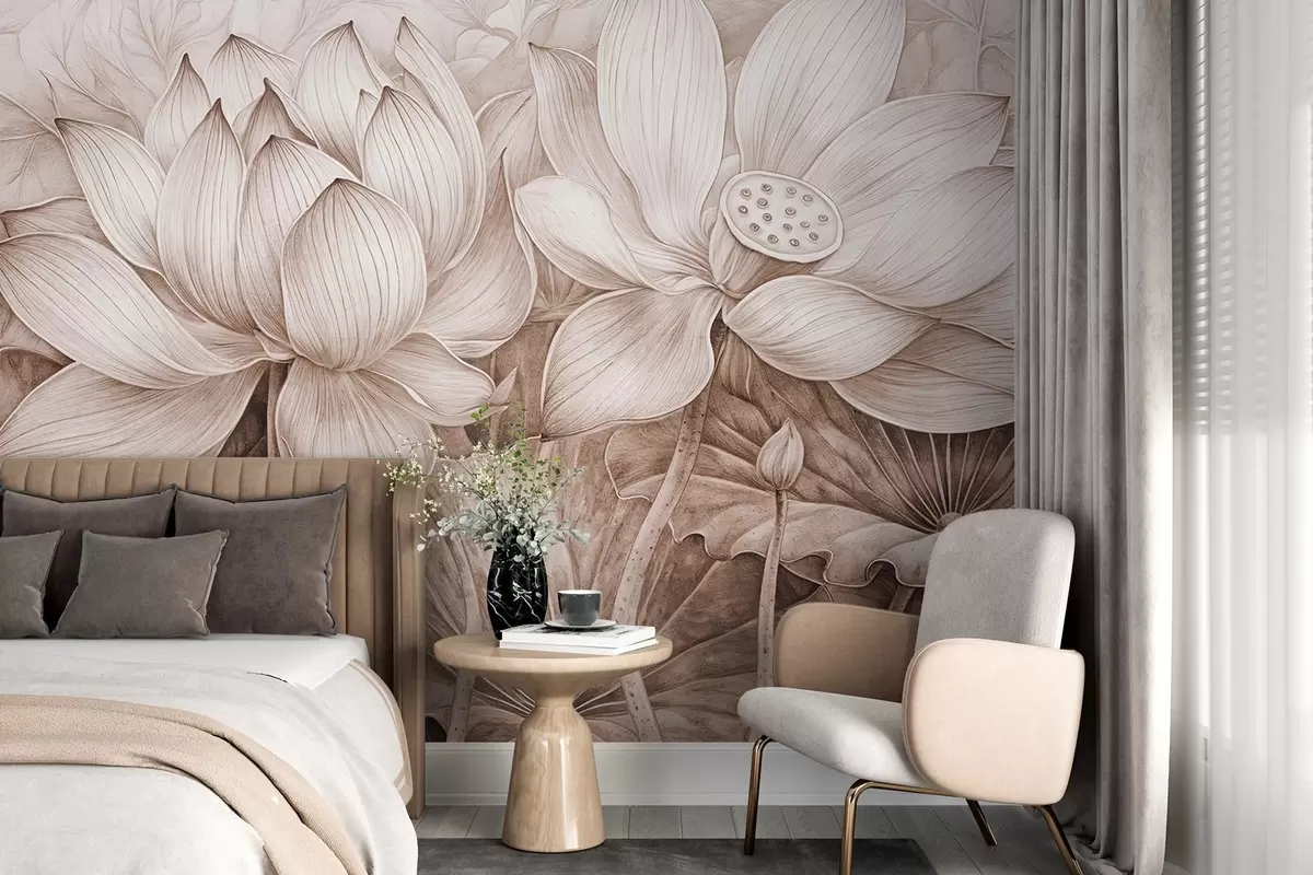Fotomurales Varias flores grandes de loto beige con textura detallada y hojas y tallos marrones sobre fondo claro Nr. w08465v1