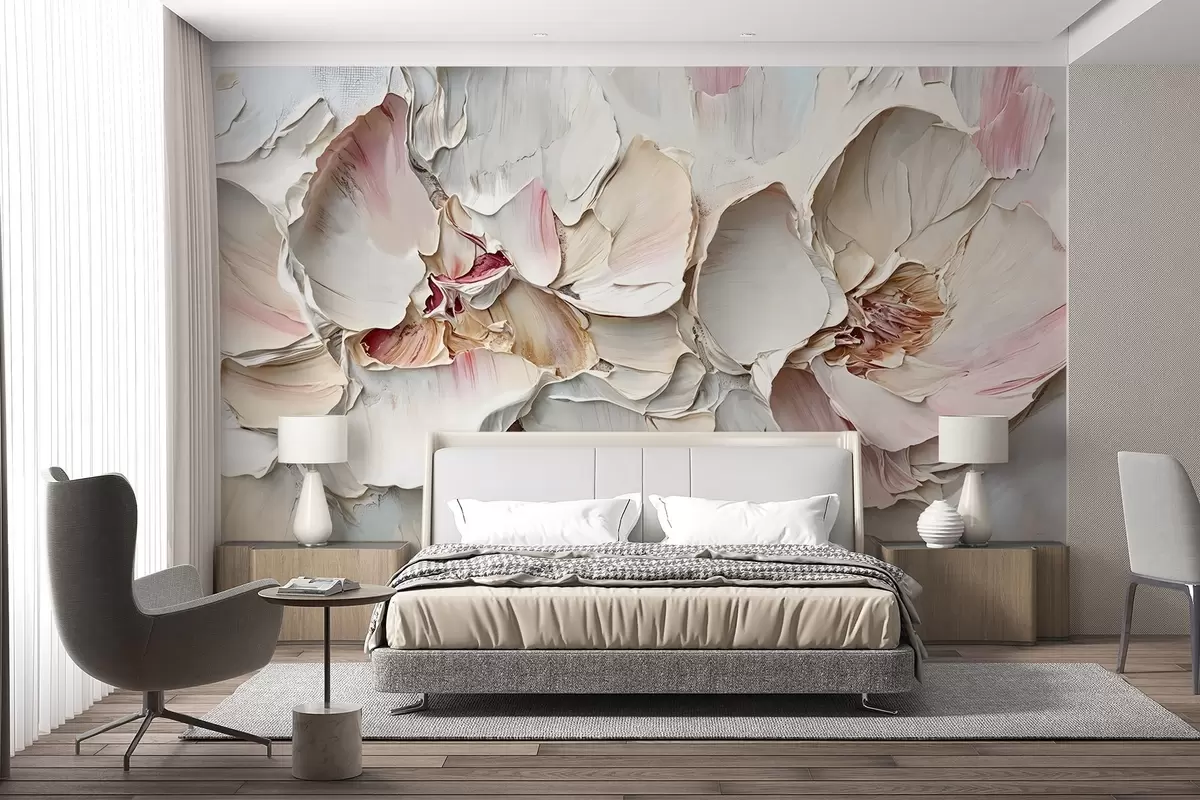 Fotomurales Delicadas flores de color rosa pálido con suaves pétalos en capas sobre un fondo de textura apagada imitación de pintura al óleo empastada Nr. w08467