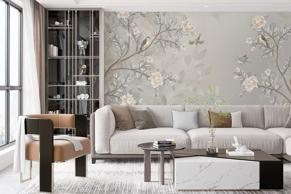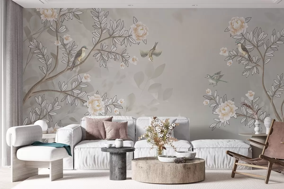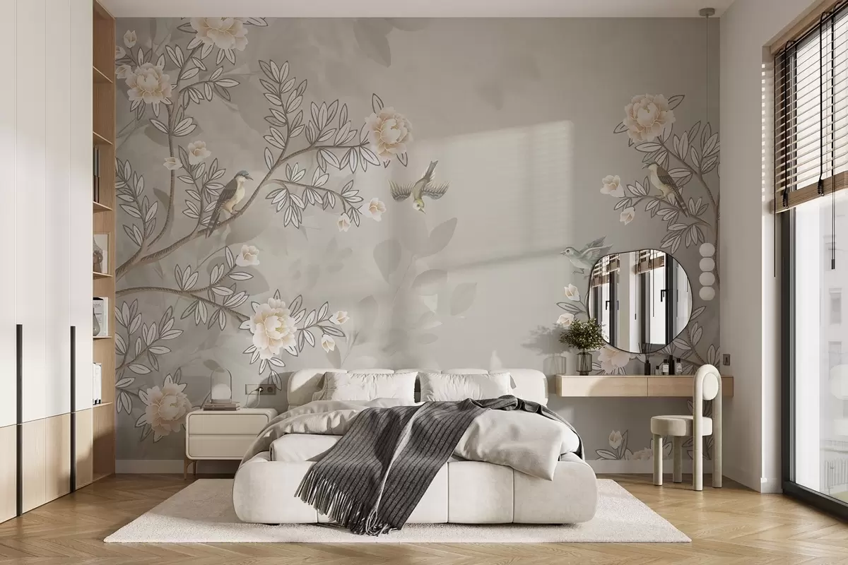 Fotomurales Ramas con rosas y pájaros volando en tonos claros Nr. w08493