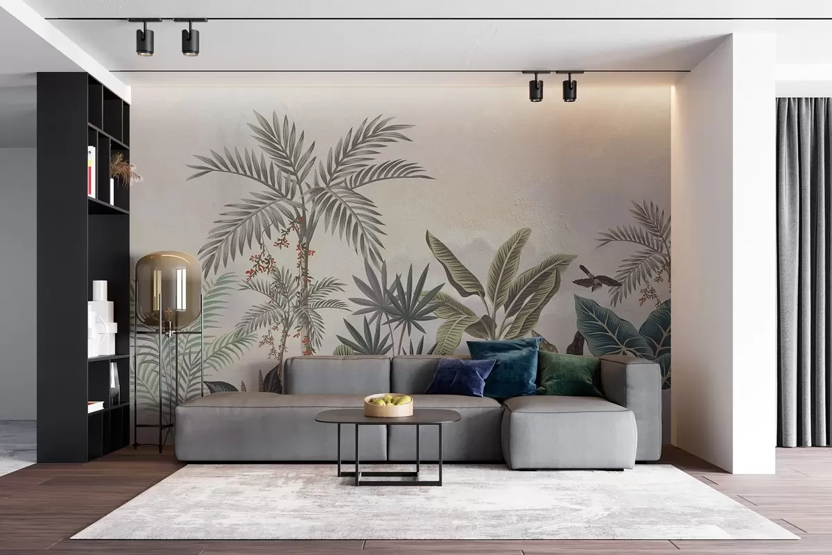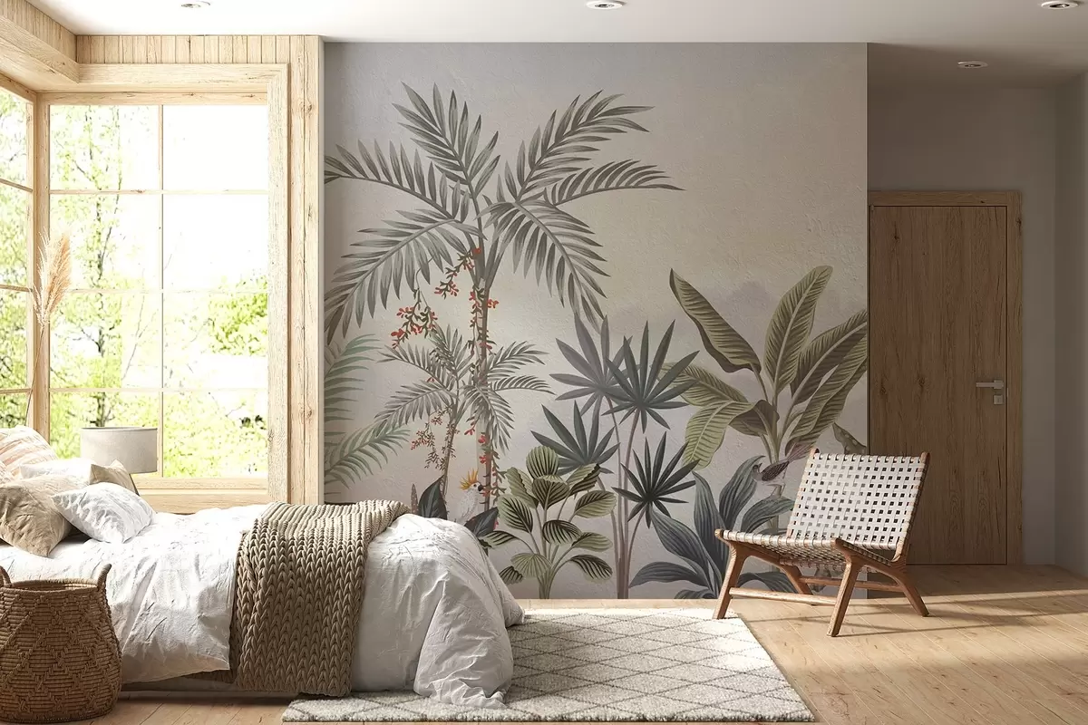 Fotomurales Selva tropical con palmeras y pájaros de colores Nr. w08496