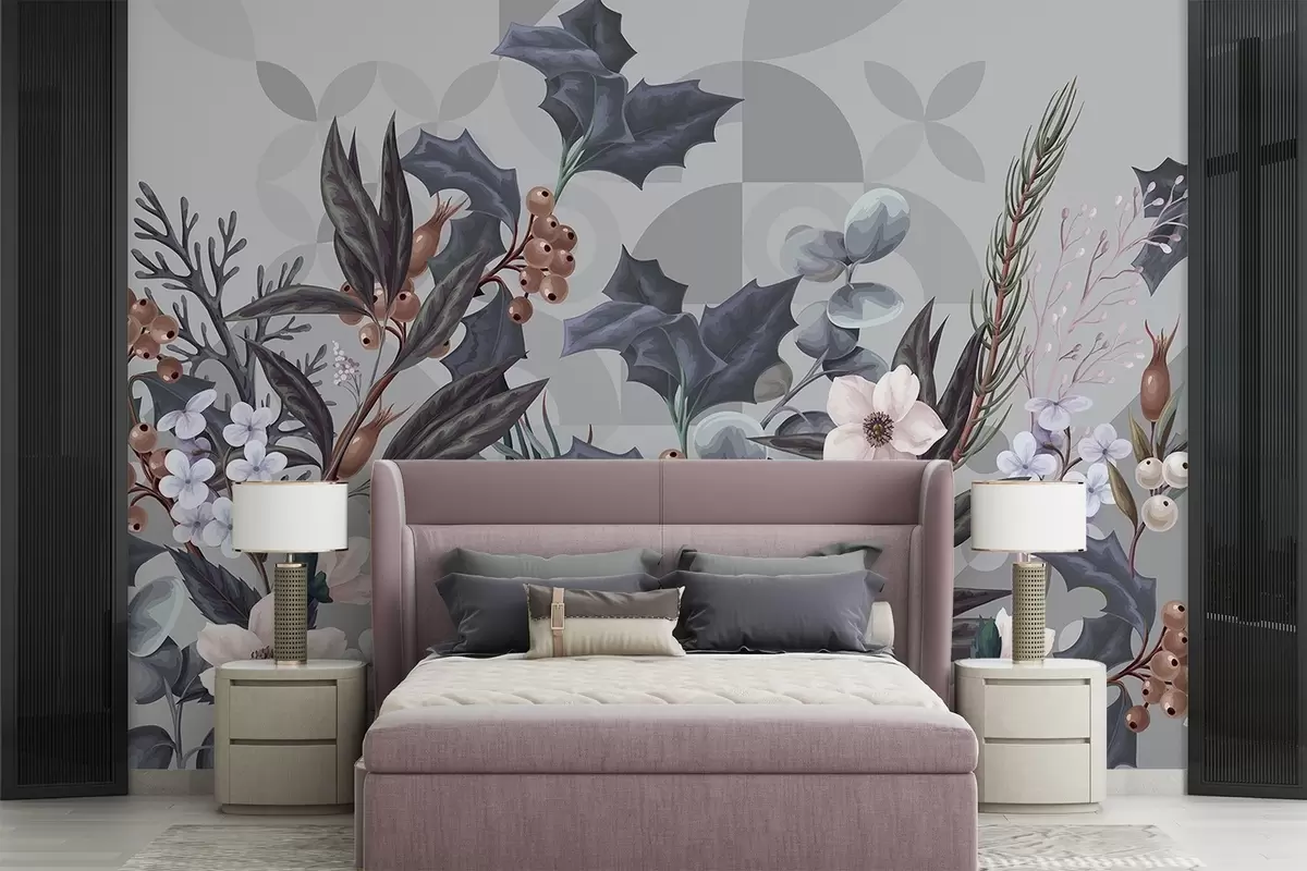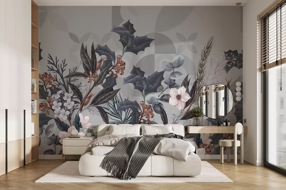 Fotomurales Arreglo floral con grandes hojas oscuras, flores y bayas sobre un fondo abstracto geométrico gris apagado Nr. w08525
