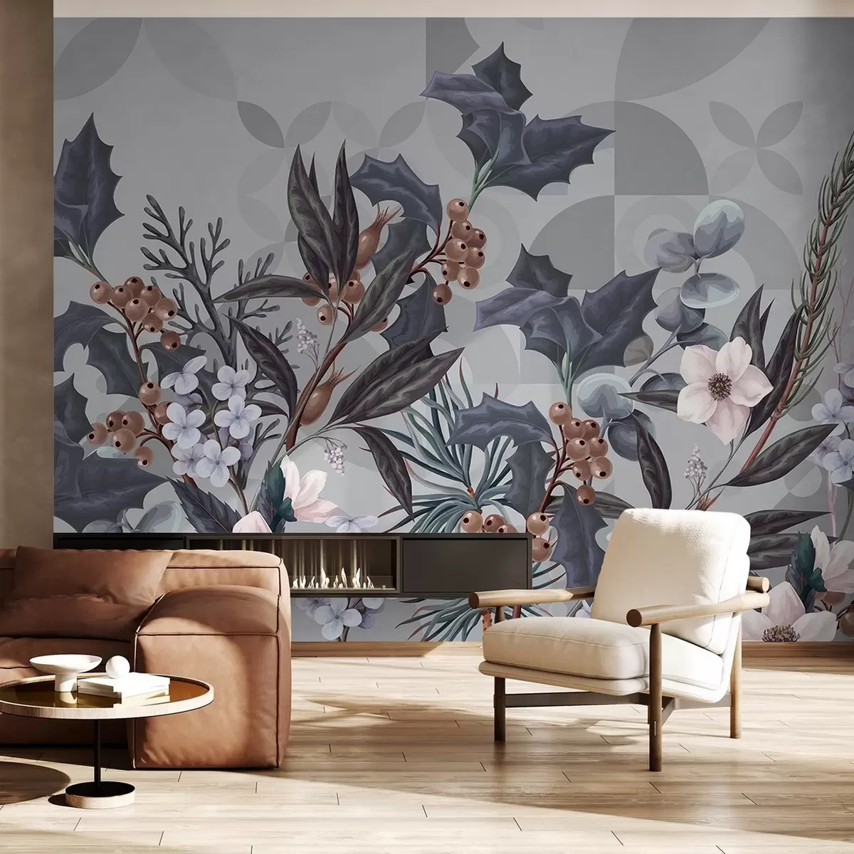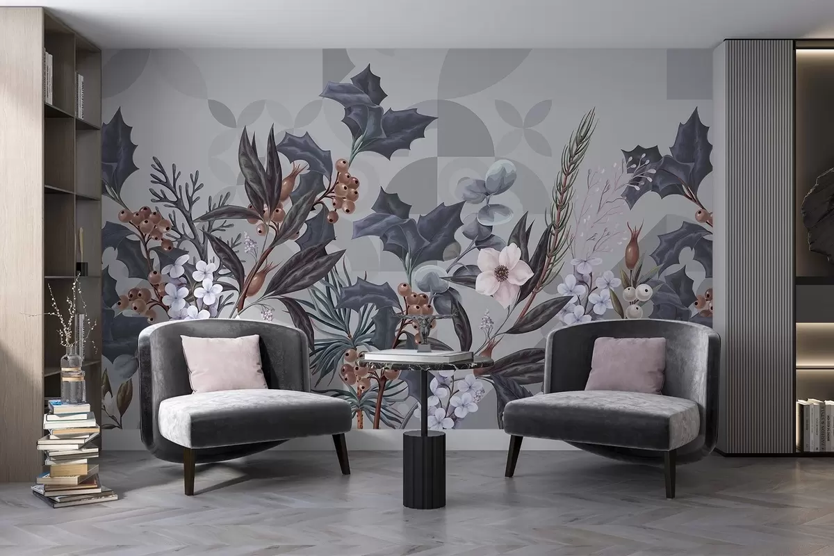 Fotomurales Arreglo floral con grandes hojas oscuras, flores y bayas sobre un fondo abstracto geométrico gris apagado Nr. w08525