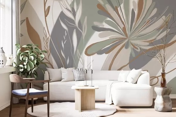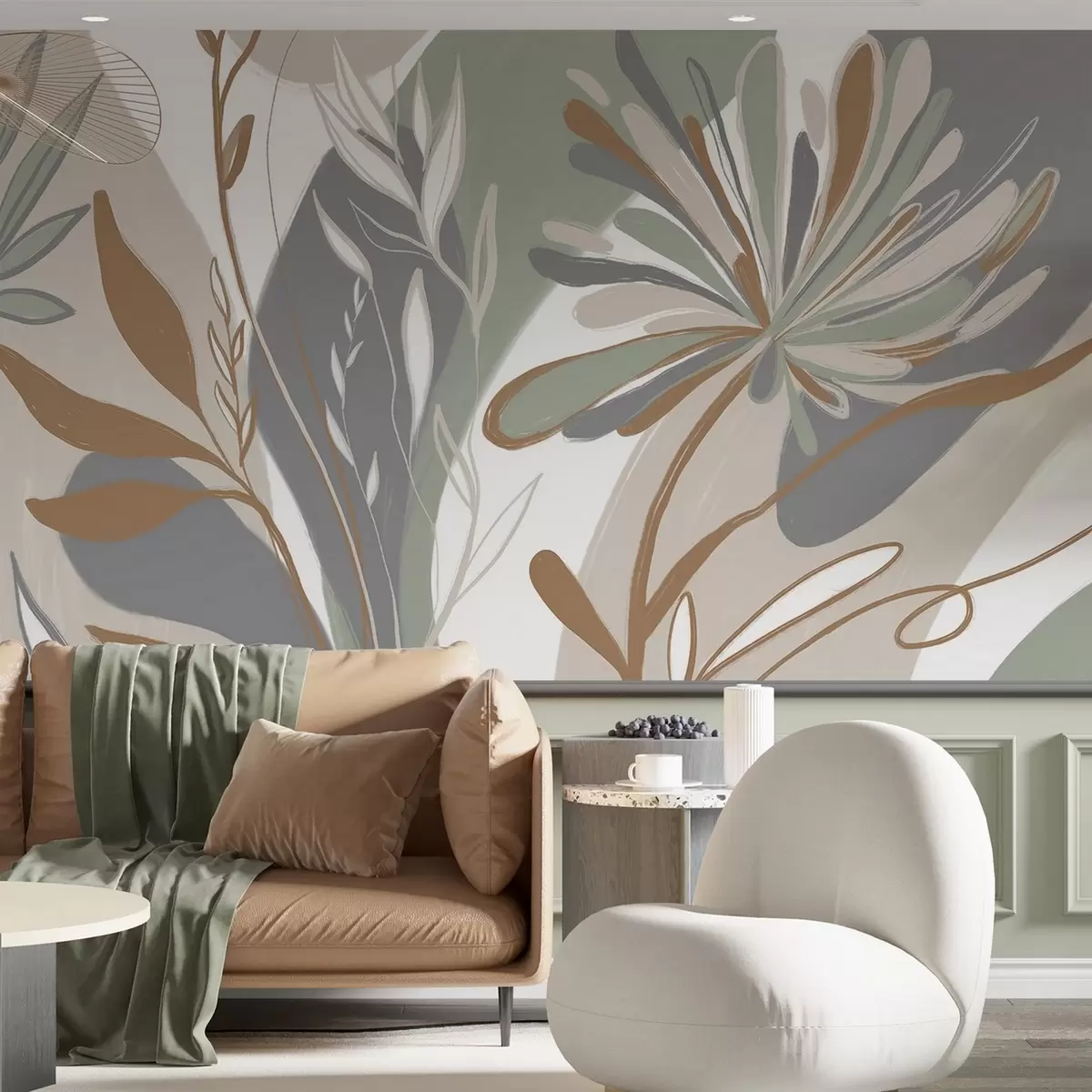 Fotomurales Estampado abstracto floral minimalista con hojas y pétalos estilizados en tonos verdes, grises y beige Nr. w08536