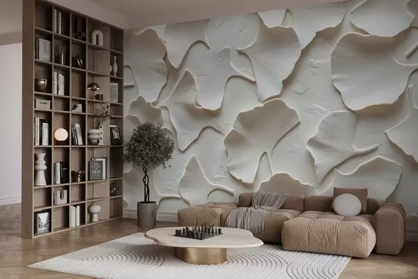 Fotomurales Estuco con delicado relieve de hojas de ginkgo sobre fondo blanco Nr. w08560v1