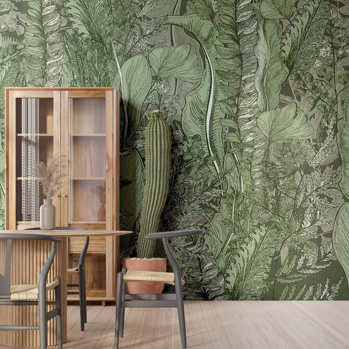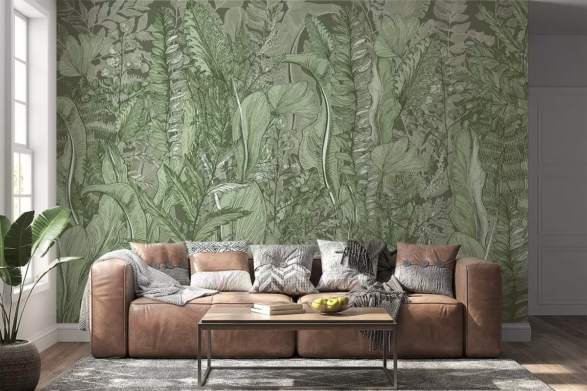Fotomurales Un bosque frondoso y verde con varios tipos de helechos, hojas y follaje en tonos verdes Nr. w08579