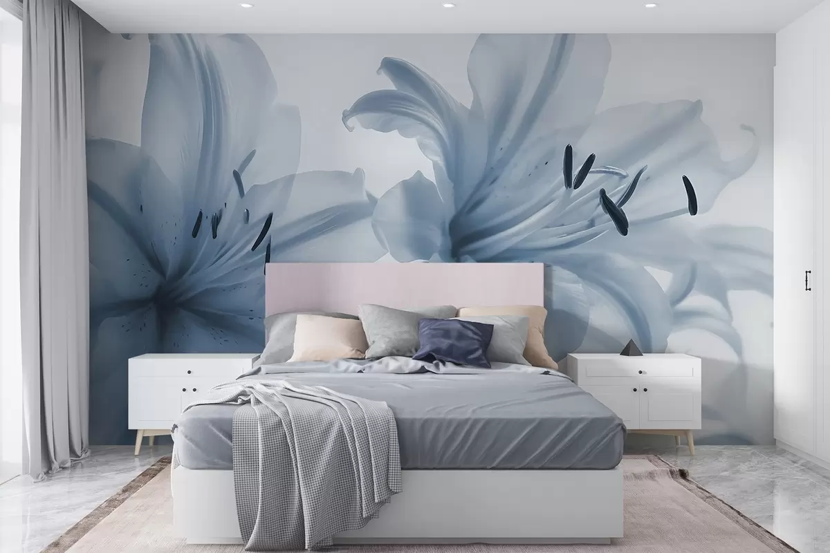 Fotomurales Primer plano con enfoque suave de flores de lirio azules minimalistas sobre un fondo claro Nr. w08586