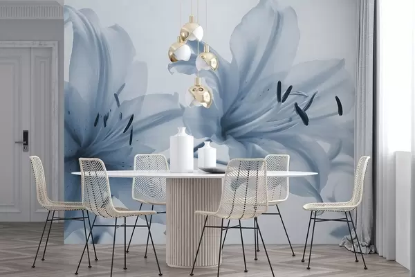 Fotomurales Primer plano con enfoque suave de flores de lirio azules minimalistas sobre un fondo claro Nr. w08586