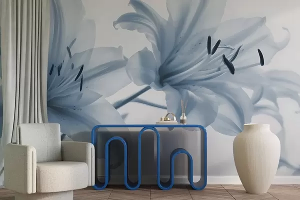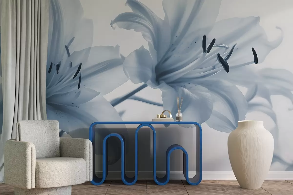 Fotomurales Primer plano con enfoque suave de flores de lirio azules minimalistas sobre un fondo claro Nr. w08586