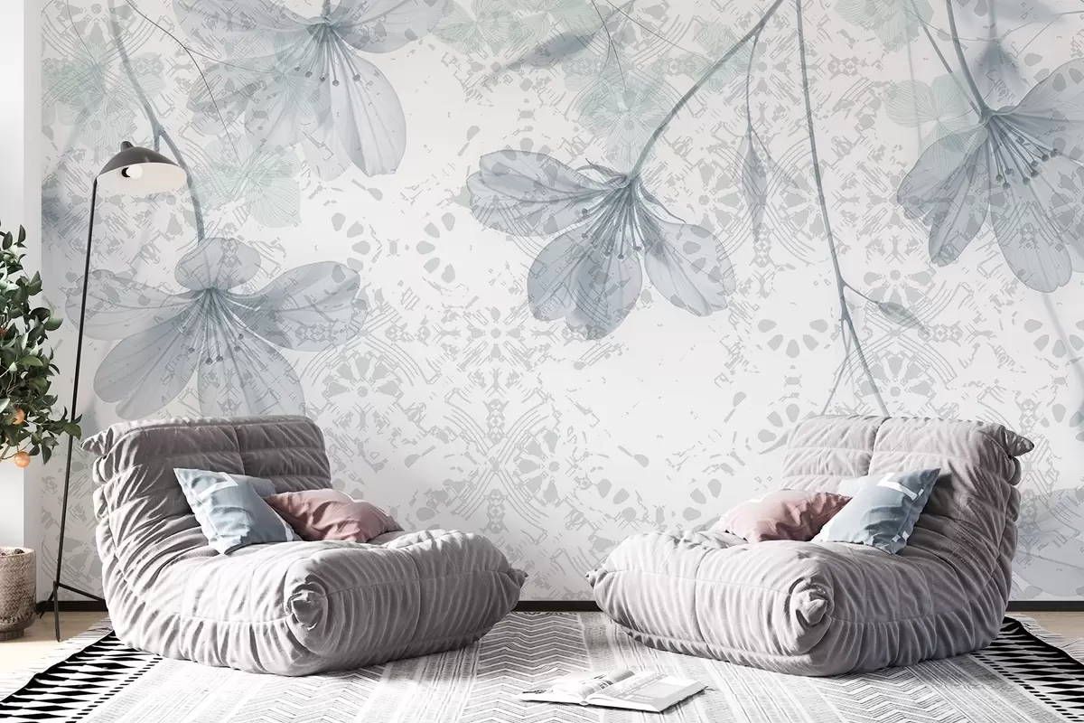 Fotomurales Delicadas flores azules y blancas con largos tallos y pétalos sobre un fondo de textura suave y difuminada Nr. w08588