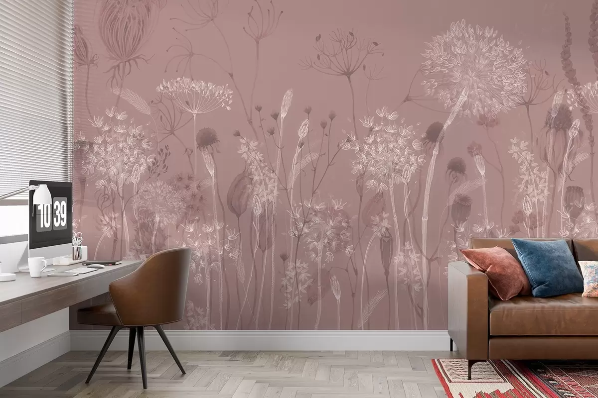 Fotomurales Dientes de león y flores silvestres en estilo acuarela en tonos rosados Nr. w08637v1