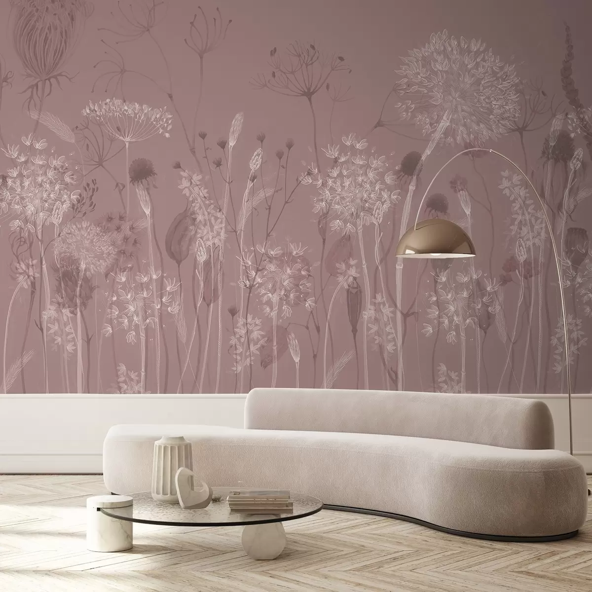 Fotomurales Dientes de león y flores silvestres en estilo acuarela en tonos rosados Nr. w08637v1