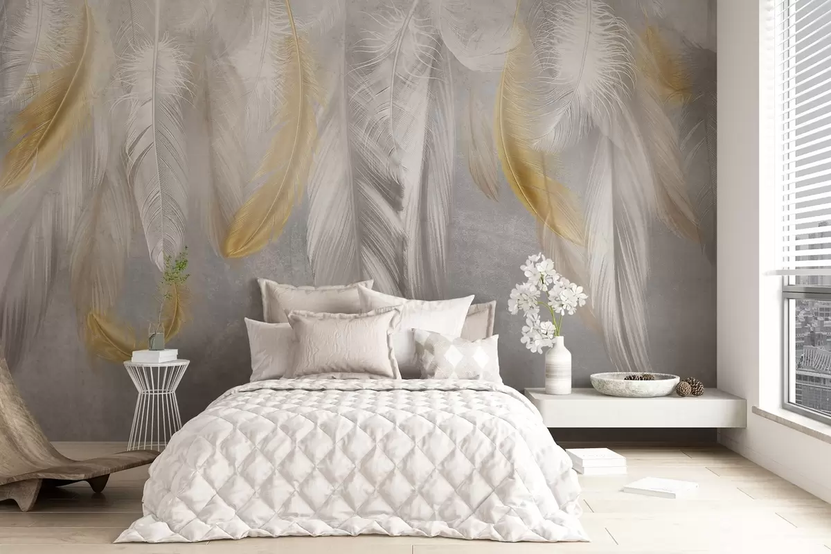 Fotomurales Plumas blancas y amarillas que cuelgan sobre un fondo gris suave, creando una composición delicada y aérea Nr. w08670