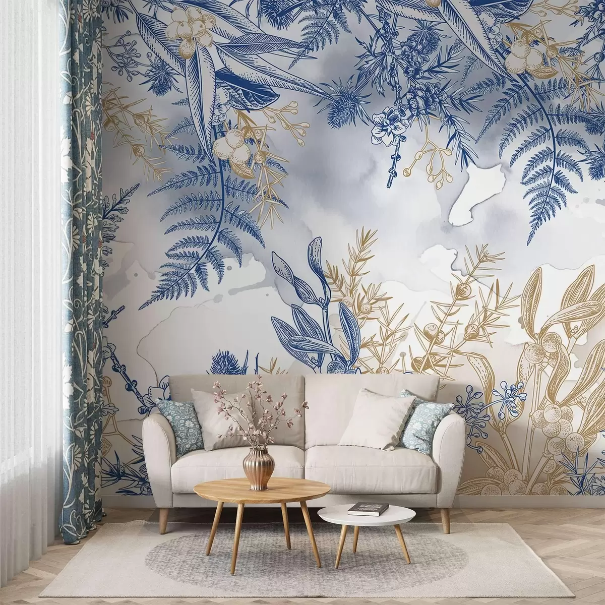 Fotomurales Estampado floral con elementos botánicos azules y amarillos, sobre un fondo claro y suave con efectos de acuarela Nr. w08671