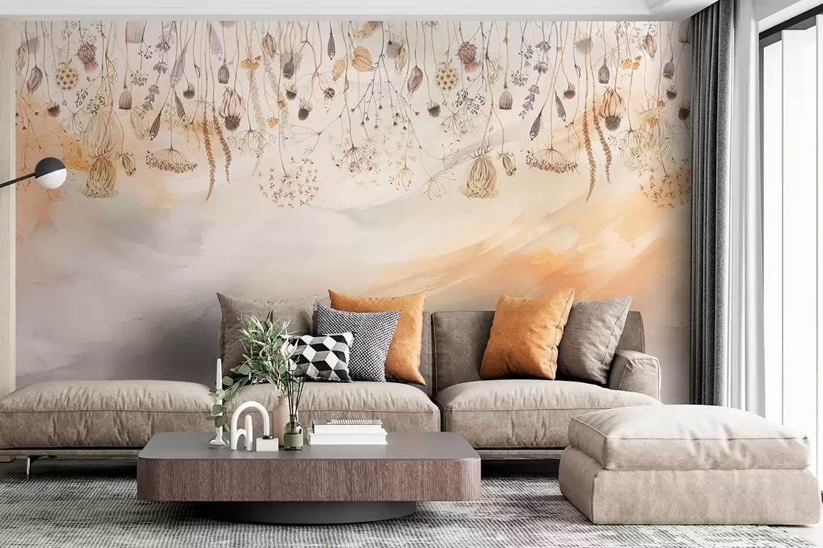 Fotomurales Flores silvestres en estilo acuarela en tonos pastel sobre fondo de pinceladas Nr. w08681