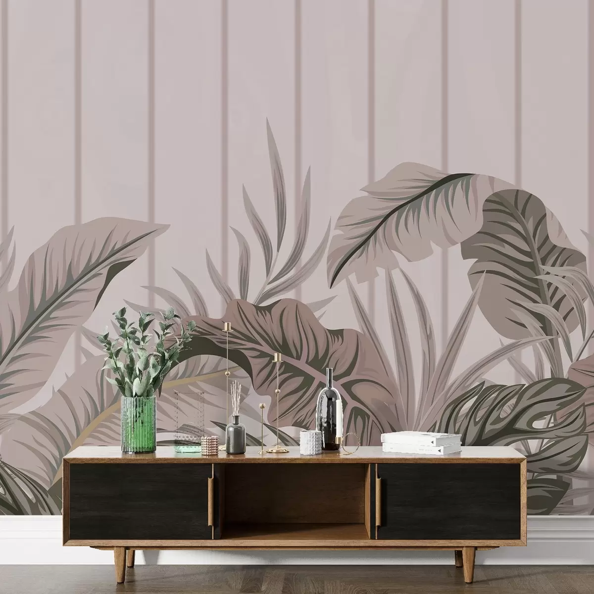 Fotomurales Motivo de follaje tropical en tonos verdes y beige apagados sobre fondo claro con líneas verticales Nr. w08683v1