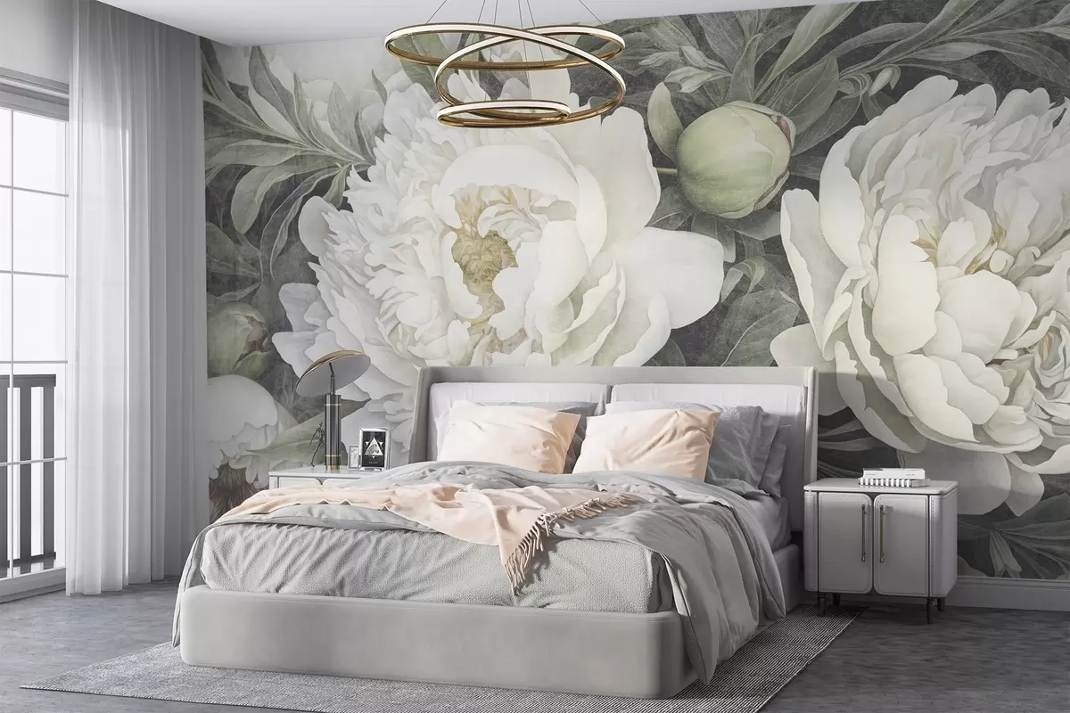 Fotomurales Peonías blancas pastel texturizadas con suaves capullos verdes y hojas con delicados pétalos Nr. w08697